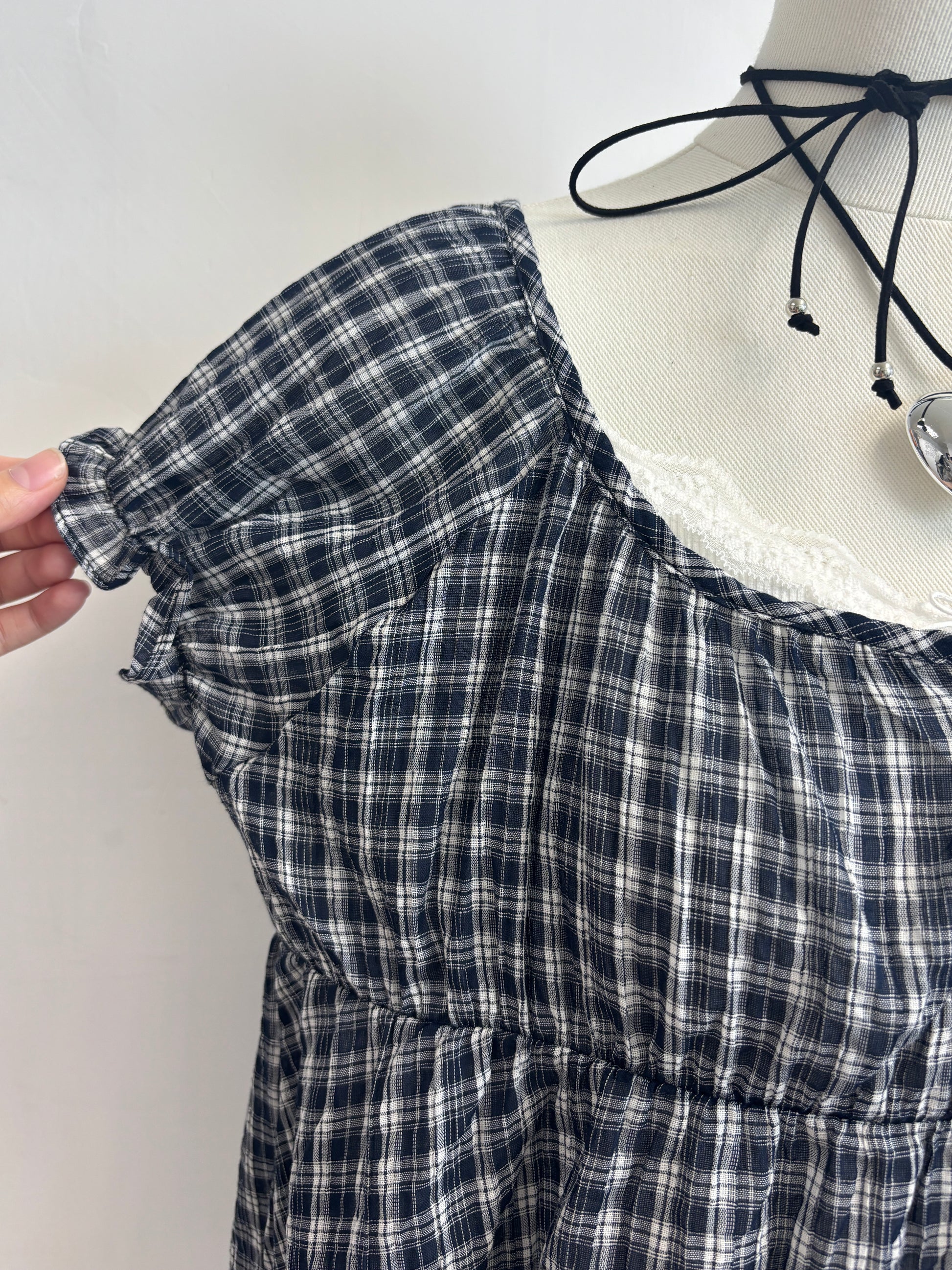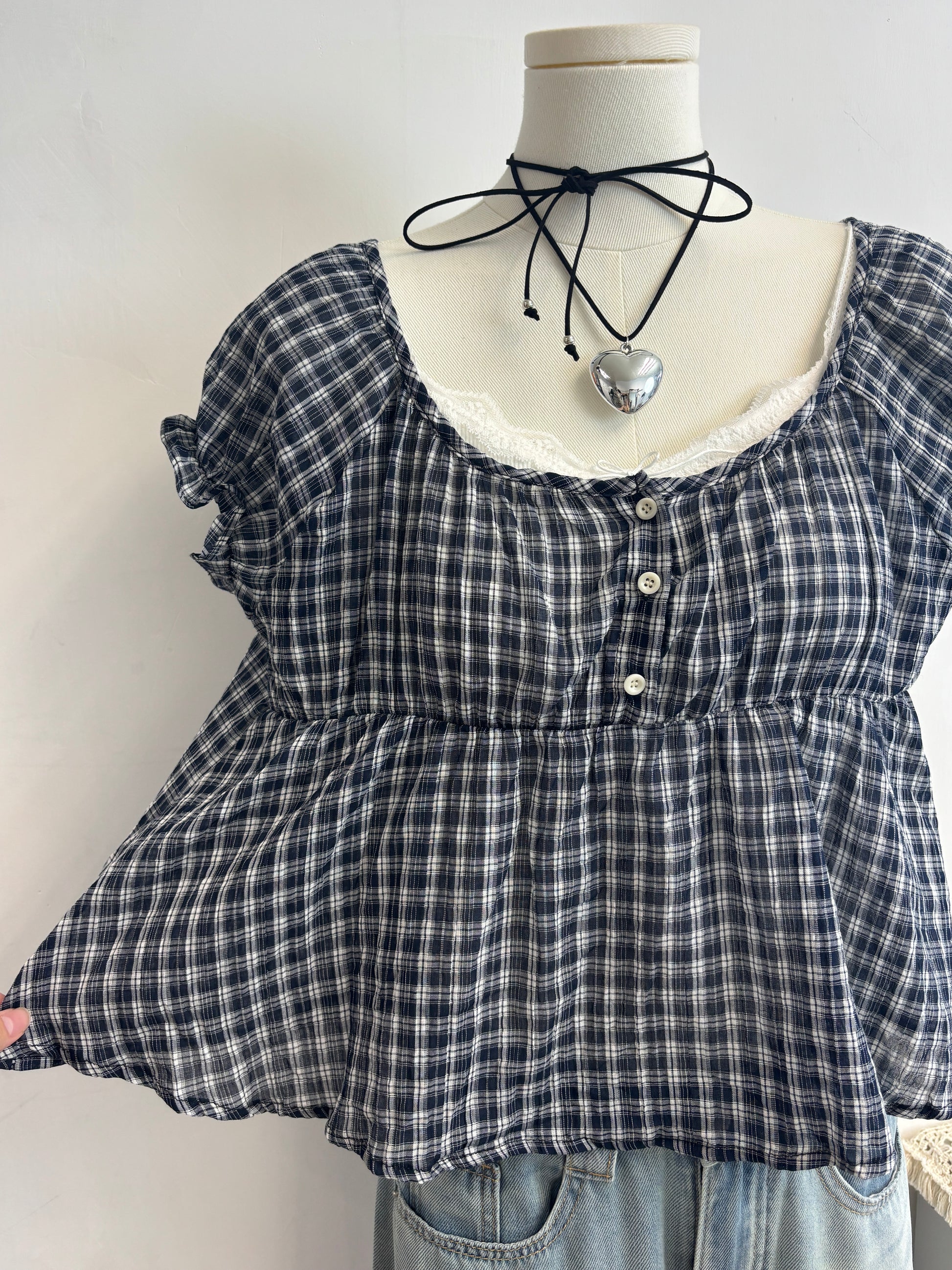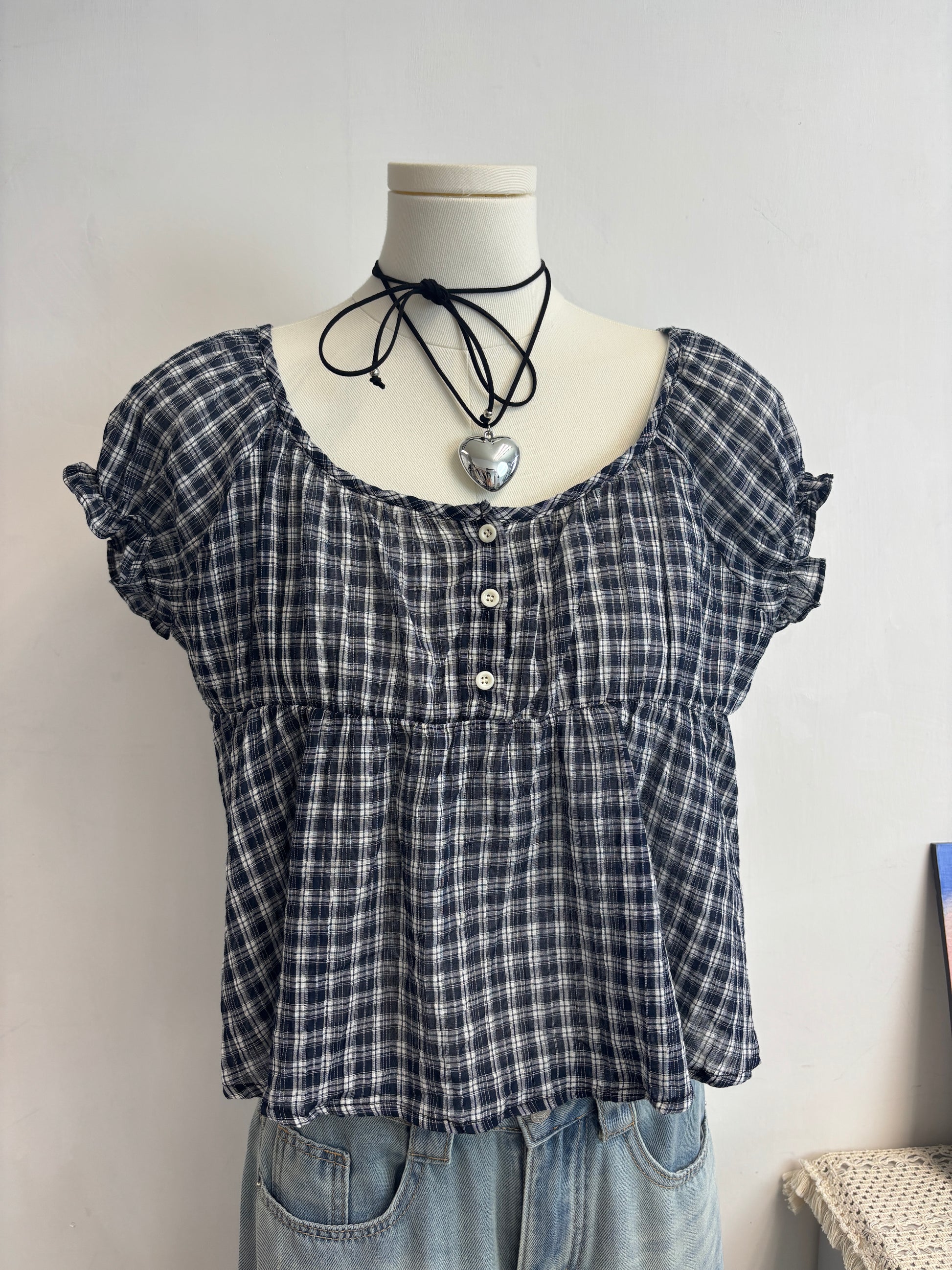 皺皺料超薄格仔上衣 T00115